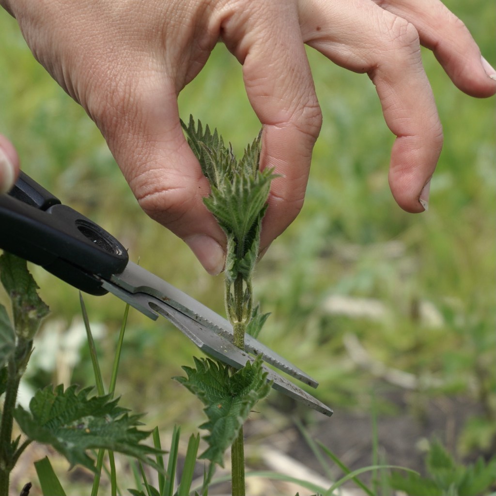 I prefer to harvest nettle in the late morning after all the morning dew has dried up, you never want to harvest a wet plant. Afternoons and evenings are also okay for harvesting though herbs tend to be more potent earlier in the day. Never get carried away and collect all nettle you find but remember to leave enough for others and for the plant to survive and reproduce. You may want to wear gloves to avoid being stung, however, I’ve found that if you with a gently firm grip grab a hold of its leaves and along its hairs, it won’t sting you. I tend to cut off the very top leaves and stems, about 10cm, with a pair of scissors for my harvest but the whole plant can be used. Before I start preparing medicine or food with my harvested nettles I make sure to spread them out on a tray or the like and leave them for a few minutes to allow any poor little insect that accidentally got harvested to crawl off and thrive elsewhere.